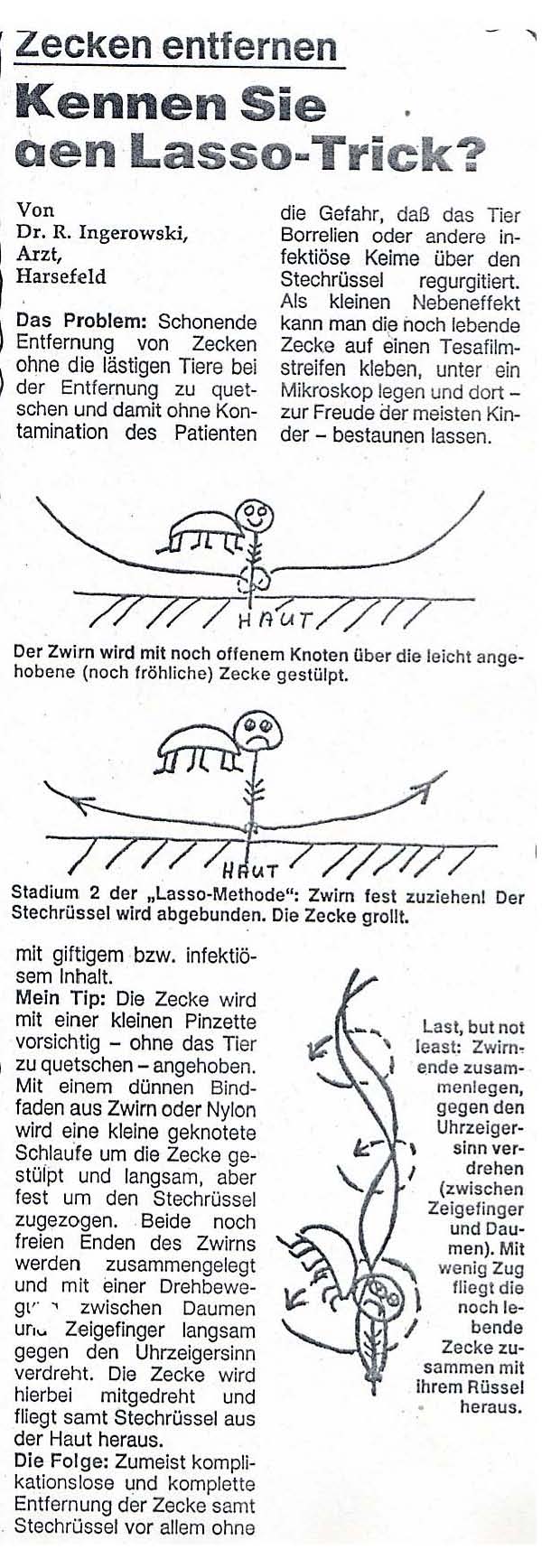 Manche Erfindungen sind so genial, dass man sich fragt, warum dafür nicht längst ein Nobelpreis vergeben wurde. So schickte mir ein ärztlicher Kollege neben einer begeisterten Kritik meiner Kolumnen eine neu entwickelte Zeckenzange per Post. Dieses Instrument verfügt neben der bekannten Pinzettenform auch über eine Art Greifballonkopf, der die Zecke dicht umschließt. So ist ein Zerquetschen nicht möglich. Zusätzlich verfügt die Zange über einen eingebauten Drehmechanismus, der die Zecke nach dem Umschließen automatisch entgegen dem Uhrzeigersinn herausdreht. Hervorragend!