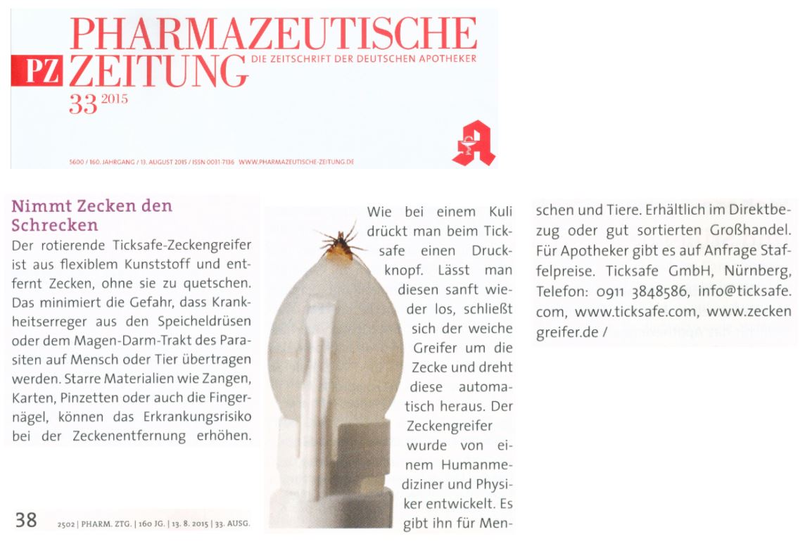 "Für die Entfernung von Zecken bietet die tickSAFE GmbH den tickSAFE Zeckengreifer an. Er besteht aus flexiblem Kunststoff und soll Zecken entfernen, ohne sie zu quetschen. Der tickSAFE Zeckengreifer wird dem Unternehmen zufolge über der Zecke plaziert und wie bei einem Kuli ein Drucknopf gedrückt. Beim Loslassen schließt sich der Greifer um die Zecke und dreht diese dann "automatisch" heraus. Der Zeckengreifer wurde von einem Humanmediziner und Physiker für Menschen und Tiere entwickelt. Apotheker erhalten auf Anfrage Staffelpreise."