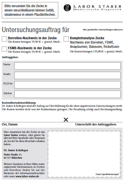 Hier finden Sie drei Beispiele für Untersuchungsaufträge, um Zecken auf Krankheitserreger zu untersuchen (zum Original-PDF bitte auf das Formular klicken)