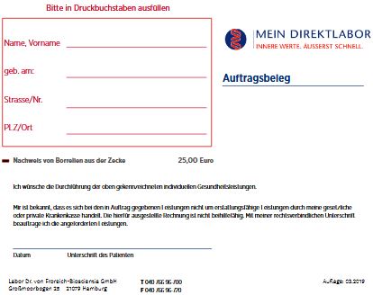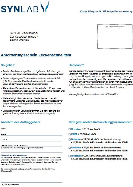 Verschiedene Labore bieten eine PCR-Untersuchung der Zecke auf Krankheitserreger an. Zum Einschicken der Zecke drucken Sie den unten aufgeführten Untersuchungsauftrag aus. Kleben Sie die Zecke mit einem Klebeband, wie in dem Video unten beschrieben, an die dafür vorgesehene Stelle. Bei großen, vollgesogenen Zecken empfiehlt es sich, die Zecke in einer sicher verschließbaren Aufbewahrungskapsel dem Formular beizufügen.