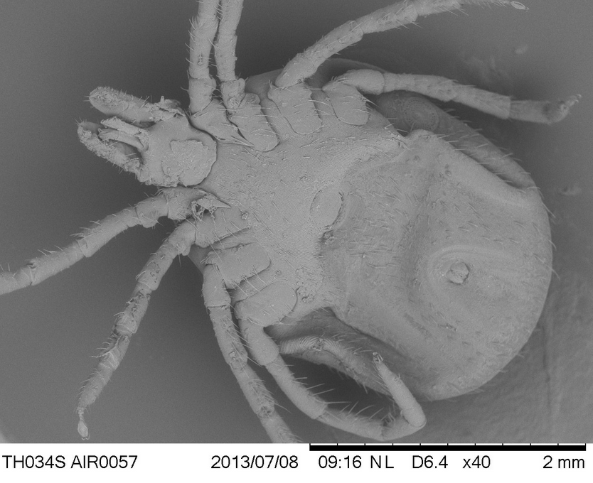 In Skizze 1 hat die Pinzettenspitze den Durchmesser eines Zeckenbeines (ca. 0,2 mm, siehe Maßstab im nachfolgenden Bild). Dadurch entsteht der Eindruck, der Pinzettenarm drückt nicht auf den kopfnahen Zeckenkörper. Eine fatale Täuschung, denn Teile der Speicheldrüsen (hier können sich FSME-Viren befinden) und des Darmes (hier können sich Borrelien befinden) liegen bereits im kopfnahen Drittel der Zecke. Erschwerend kommt hinzu, dass sich manche Zecken so tief in den Wirt eingraben, dass bei ihrer Entfernung in jedem Fall Druck auf den Zeckenkörper ausgeübt wird.